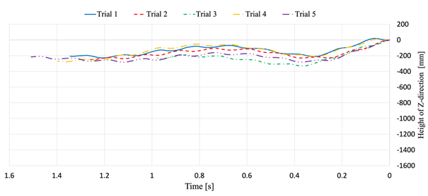 Figure 5 shows an example of a sequence of images of the flight taken by the high-speed cameras. Figure 6 shows the transitions of the flight height (0 mm at the starting point) for five trials. These are the results of about 1.5 seconds of analysis possible from the angle of view of the high-speed cameras (straight-line distance is about 2 m). It can be confirmed that the FMAVs descend slightly immediately after the start of the flight but then fly while maintaining a constant altitude. The butterfly periodically raises and lowers its body during flight, which causes it to sway up and down. Figure 5 and Figure 6 show that our developed FMAV achieves flight similar to that of a butterfly.