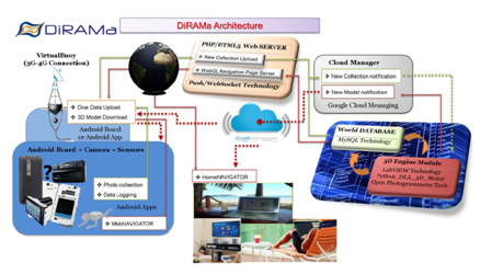 In order to accomplish the need of environmental monitoring in an autonomous or semi-autonomous way, in the past years Università Politecnica delle Marche team developed DiRAMa,24 a platform designed for image acquisition and three-dimensional reconstruction of submarine environments. The principal innovation brought by DiRAMa is the integration of multiple heterogeneous knowledge concerning the marine and underwater habitats using tested and reliable COTS component. This project aimed at providing greater data processing, implementing 3D reconstruction algorithms on an external server; this expands the list of possible results with a three-dimensional model of the area explored. The outcomes can be stored in the most common three-dimensional formats like PLY (Polygon File Format), OBJ + MTL, DAE (Collada), and PDF, due to the importance of letting reconstruction being modifiable with software suites of common use or open source, even directly from the mobile device employed for taking mission data. In Figure 2 a schematic representation of DiRAMa system is presented.
