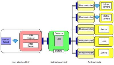 - Payload unit: A Payload Unit is any compatible device that the diver wants to control through the User Interface Unit Android application or through the embedded screen and buttons of the Motherboard Unit. In the Figure 4 it is possible to see five different payloads (two different Wi-Fi cameras, one sensor, one light and one battery) these peripherals are a sort of intelligent devices; in fact, the single component or sensor is not directly connected to the communication bus but through a microcontroller that receives the commands and executes them.