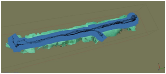 After the dive the gathered data set is uploading to the DiRAMa servers. The time for obtaining the 3D model depends mainly on two factors: the number of the photos and the quality requested. A low quality model can be available with few hours of elaboration and this means that the researchers can better organize another survey for the same day or the day after analyzing the site models obtained with the feedback. The high quality model is instead available in 1 month, together with the possibility of having also its 3D print. In Figure 5 the low quality model resulted from the mentioned missions is shown. It was obtained from the elaboration of about 200 photos in four hours. The high quality output can be produced in different formats, so manageable with different kind of software and for different kind of usages. It can be imported in virtual environments like common game engines (the authors use Unity) or common GIS (the authors use QGIS) which makes its fruition easier. In parallel to the reconstruction process, from the cameras alignment and correspondence steps, is possible to recover also the trajectory followed by the diver. An example of this output related to the pipe inspection is illustrated in Figure 6. It can be noticed that the diver started the survey from the middle of the pipe and the continued along its length. In this phase the filtering algorithm was implemented on a National Instrument MyRIO and tested on the DocuScooter which was moved only on the surface to allow acquiring the GPS data. Due to the particular nature of this test, no depth sensor has been involved in the algorithm. The IMU used during this test was an Xsens MTi-3-8A7G6, installed on center of gravity of the vehicle. The Ad fruit Ultimate GPS v3 has been used to receive the GPS signal with an active antenna. The accuracy of this sensor is about 3 meters. These two sensors have been used to feed the data to the UKF algorithm.