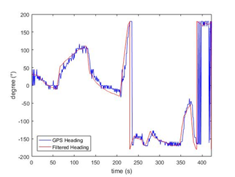 It is possible to observe that only in the first seconds the filtered position doesn’t track perfectly the GPS because the accelerometer bias wasn’t compensated, as confirmed by position error (Figure 8). Confirming a good behavior of the UKF, Figure 9 shows the track of the estimated heading compared to heading computed by the GPS. In this case the gyro bias is very small, so the filter works well also in the first’s instants.