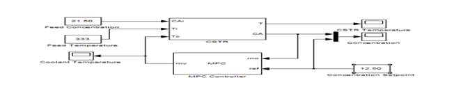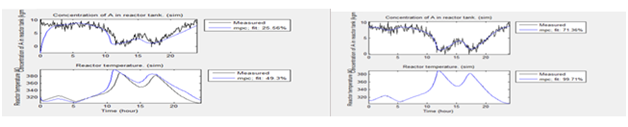 The controller did not attempt to regulate the measured reactor temperature directly. However it varies since it needed to regulate the concentration. Thus, its MPC weight is zero. Each of these parameters was chosen carefully to attain the best controller performance and the least controller moves. Plant inputs CAi and Ti are unmeasured disturbances as shown in Figures 4–6. By default, the controller assumes integrated white noise with unit magnitude at these inputs when configuring the state estimator and increasing the state estimator signal–to–noise by a factor of 10 to improve disturbance rejection performance. The MPC Controller block was configured to look ahead the set–point changes in the future, i.e., anticipating the set–point transition which improves set–point tracking as shown in Figure 8, Figure 9. Testing the response to a 5% increase in feed concentration, the closed–loop response is satisfactory to the desired set–point transition.