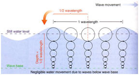 Water wave is an orbital wave in which particles moves in an orbital path. These waves transmit energy along the interface between two fluids of different density. Orbital motion dies out quickly below the surface. At some depth below the surface, the circular orbits become so small that motion is negligible. This depth is called the "Wave Base". Wave base can be regarded equal to one–half the wavelength (l/2) measured from still water level (Figure 1). Only wave length controls the depth of the wave base, so the longer the wave, the deeper the wave base. The decrease of orbital motion with depth has many practical applications. For instance, submarines can avoid large ocean waves simply by submerging below the wave base. Even the largest storm waves will go unnoticed if a submarine submerges to only 150meters.1 Floating bridges and floating oil rigs are constructed so that most of their mass is below wave base, so they will be unaffected by wave motion. In fact offshore floating airport runways have been designed using similar principles. Additionally, seasick scuba divers find relief when they were submerged into the calm, motionless water below wave base.1 Therefore, deep water defines as depth more than l/2. The hydrodynamic forces of ocean surface wave on the submerged bodies are studied in a number of fields of engineering such as: