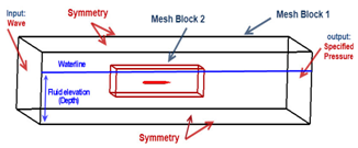 The general configurations and dimensions of domain are shown in Figure 6. The length and width are 12 and 2.6meters. Depth is 4 meters (3.5 for draft and 0.5 for freeboard). The boundary conditions are: Input: wave, Output: Specified pressure and other sides are symmetry. The model is situated in different depths of "h" according to Figure 6a. There are two mesh block: one block for the total domain with coarse meshes and other block for fine meshes around the object body. The accuracy of the shape of the body depends upon the fine meshes (Figure 6b, Figure 6c). For producing the wave, the input boundary condition is "Wave". Flow–3D can produce regular and irregular waves. The produced wave and the situation of the object under the waves are shown in Figure 6d. The reason of selecting each parameter is mentioned below.