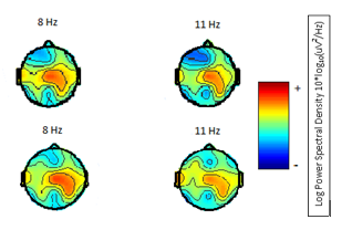 Experiments involved execution and imagination of left and right legs movements. Topographical scalp maps of participant 1 during imagery and execution of left leg movement are presented in Figure 1. Color bar indicates the spectral power concentration over the scalp for all channels in the mu frequency range. Power spectral density is represented in logarithmic scale. For participant 1 it was observed that a high spectral power concentration was in the central regions. The left leg ME enhanced the mu rhythm concentrated in the foot area representation. This was visible at both 8 and 11Hz frequencies. Similarly with MI task, the ERD was centrally localized and edged towards right parietal region, which could be an indication of contralateral dominance at 8 and 11Hz frequencies. However, this was not the case with remaining participants. After experiments with all participants, we have collected large amount of data that we analyze and try to decipher.
