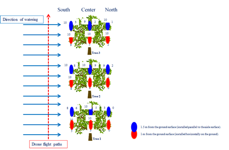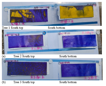 In this manual spraying experiment, water-sensitive paper was placed inside the fruit trees beforehand. It was observed how far the water reached during the spraying operation, i.e. whether it was effective as a spray. Figure 10 shows the chemical adhesion standard table and Table 2 shows the adhesion area of the adhesion standard table. Figure 11 shows example results of water-sensitive paper after spraying, Figure 12 shows the arrangement of the water-sensitive paper and the results. A number of adhesion indices of 10 were observed, indicating that the sprayed water adhered well.