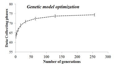 The baseline considered here is when no genetic operation is performed and the sink positioning is totally random. Figure 6 shows the results comparing the network lifetime recorded by the number of cycles (as a function of the number of generations ran by the genetic algorithm). It can be seen an increase of the network lifetime from the first measures to the last ones. Comparing this with the random solution recorded as “zero” genetic generations in Table 5, the network lifetime increases up to 200%. It can be observed a network lifetime close to 75 collecting phases indicating a possible limit to an optimum solution. Considering the resources of 100 transmission packages per node, and cost of forwarding messages to the sink, this solution may be considered a promising one. The theoretical maximum of 100 collecting phases only can be reached if all nodes send data directly to a sink position, what is not possible to the test mass used. This possibility does not represent an issue at all, since it can easily solved sending all collected data directly to the sinks.