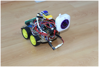 Throughout the development of the master thesis,9 the development of a four-wheel robot was carried out to be controlled through the web. This construction includes DC (Direct Current) motors, lights and Wifi. The robot controller is an Arduino UNO board. The power supply used is a LiPo battery for the controller and the DC motors. Furthermore, other LiPo battery was used to power the WiFi camera. When having to drive four DC motors, an Arduino Shield has been used to control continuous motors stacked on top of the Arduino. Figure 1 shows an image of the 4-wheel robot. This robot is controlled using a web browser hosted on a PC (Personal Computer). A demonstration is provided in Youtube (https://youtu.be/oI64VkhQAfM).