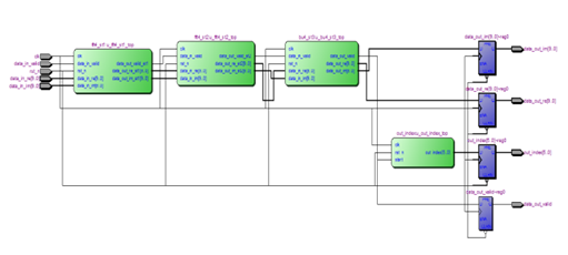 Due to complete a 64-point FFT calculation function for the project, the schemes may be selected from the following table (Table 1).8 I use statistical results to select the most suitable circuit structure. If I select the radix-2 scheme, the BR2MDC is better relatively due to the 100 utilization rates and its hardware control is simple relatively. However, since the BR2MDC increases the number of the buffer units, the hardware area used is increased greatly. On the other hand, if I selected the radix-8 scheme, the hardware utilization rate of R8SDF is less than before, but its hardware control is very complicated.9 Thence, the radix-4 scheme is the best choice, and the entire circuit is divided into three levels. Moreover, the hardware utilization rate of R4SDF is few, and its hardware control is not complicated. Therefore, this project uses the radix-4 single-path structure (R4SDF).