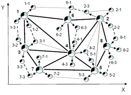 Let us consider a possible further hierarchical extension and growth of the created network, by introducing additional subordinate nodes to the already created top nodes with establishing directed management links from them, as in Figure 7, with possible SGL scenario following. Three subordinate nodes (with digital sub-names from 1 to 3) for each top node are planned, with a randomly defined distance to them within certain threshold (expressed in italics).