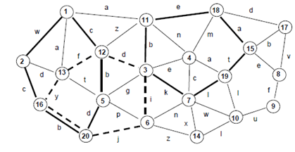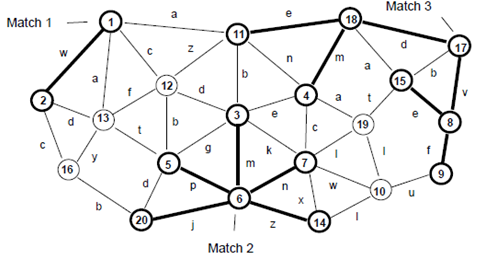 Some of the found matches are shown in Figure 21 in bold or dashed lines if solutions intersect, where full result includes all triangles. Each match will actually have repetitions, as its search starts from all nodes of the same solution, also develops in both ways in the ring (like clockwise and counterclockwise), which will be reflected by indices of the resultant values of X and Y variables.