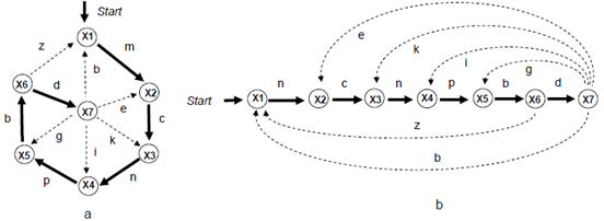 Multiple repeated solutions, which may start from each node of the ring and develop in two directions, can be easily reduced to only two. This is achievable by allowing them to start only with the node having the strongest name (or address) among all nodes of the ring. In this respect, we can extend the string just before the last one in two previous scenarios as follows: