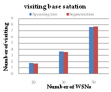 The second chart in (Figure 6B) shows the energy efficiency of our algorithm compared to spanning tree algorithm. In previous section we described each unit for energy consumption as amount of energy that a robot needs for moving in direct direction for passing 1meter. In this chart we can see the difference between two algorithms and also different environments of WSN’s nodes. In sparse area in the term of number of wireless sensors we can see in environment with only 20 WSNs segmentation strategy has energy efficiency about 44% better than single spanning tree algorithm. Chart in (Figure 6B) also provides comparison for 30 nodes in which energy consumed in segmentation algorithm is21% less than spanning tree. For energy consumption in environment with 50 nodes we can see segmentation strategy consumes about 14 present less energy than only spanning tree algorithm in average. As we can see in term of energy and completion time of combination segmentation strategy and spanning tree is more effective than using only spanning tree algorithm. This efficiency is higher in environments with sparse nodes, which is proof by experiment results. Percentage of efficiency in time and energy is more in the field with 20, 30 nodes rather than 50 nodes. (Figure 6C) provides information about average transferred packet between robots, and robots and wireless sensors. These packets contain sensory data transferred between wireless sensors and robots and contain explored and marked grid cell that transferred between swarm robots.