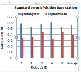 (Figure 6D) presents average frequency of returning back to base station for each robot. The average of all robots in both algorithms is almost equal with a tiny difference. Because for defined number of nodes, robots have to back to base station in equal frequency. In our experiment for harvesting 3 wireless sensor robots have to go back to the base station for dumping their memory to base station. In we can see the average of returning to base station for each robot in all iterations of both algorithms. In this chart we can see number of returning to base station differs for robots. (Figure 7) provides the segmentation algorithm efficiency for dividing task between robots. In this chart we can see the standard error for every robot is based on their number of dumping memory to the base station. This standard error is calculated as difference between average number of returning back to base station for all robots and one robot. In (Figure 7B) we can see this error is higher in simple spanning tree rather than segmentation strategy in each robot and average of all robots. Results of calculation standard error in returning back show the efficiency of segmentation strategy in dividing task between robots. Harvesting WSN’s data and dumping them to the base station is the main task. In this system harvesting task should be divided equally between swarm robots to give meaning to the team work and use all robots in same manner as they have limited source of energy.