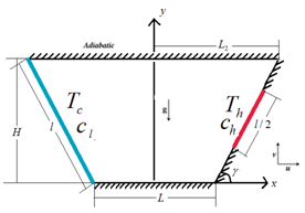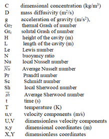 In nature and many industrial applications, there is a diversity of transport processes where simultaneous heat and mass transfer is a common phenomenon. Fluid flows which are formed due to the combination of temperature and concentration gradients are referred to as double-diffusive convection. Double diffusion convection (D.D.C) occurs in a wide range of scientific fields such as oceanography, astrophysics, geology, biology as well as in many engineering applications such as solar ponds, natural gas storage tanks, crystal manufacturing, material processing, food processing and etc. In order to have an overview of this phenomenon see some relevant fundamental works such as Turner et al.1-3 Double diffusive natural convection in enclosures has enormous industrial and geophysical applications, such as petrochemical process, fuel cells, pollutant dispersions in soil and underground water, design of heat exchangers, channel type solar energy collectors, and thermo-protection systems. Therefore, the characteristics of natural convection heat and mass transfer are very important. In recent years, a considerable number of analytical, numerical and experimental studies have been performed in order to analyze such interesting phenomenon in different enclosures. Ostrach et al.,4,5 have reported complete reviews on the subject. Gebhart6 were among the first ones to study D.D.C numerically for the cases of vertical laminar fluid motions along surfaces or in plumes. In this study, special attention was paid to the influence of non-dimensional parameters relevant to double-diffusion, on the heat and mass transport processes; transition to turbulence was mentioned. Bejan7 has reported a fundamental study of scale analysis relative to heat and mass transfer within cavities submitted to horizontal combined and pure temperature and concentration gradients. Pure thermal convection, pure solutal convection, heat transfer driven flows, and mass transfer driven flows were taken into account. Mobedi et al.,8,9 analyzed double diffusive convection in partially heated cavities. Nikbakhti and Rahimi10 studied numerically the flow, heat and mass transfer in a rectangular cavity with partially thermal active walls. They found the rate of heat and mass transfer will be a maximum when heating section located at the bottom and the cooling one on the top. A careful review of the existing literature reveals that D.D.C. have been mainly analysed in rectangular cavities and only a minority of studies have considered non-rectangular cavities and in particular the trapezoidal geometry, which is encountered in several practical applications, such as attic spaces in buildings11, greenhouses12 or sun drying of crops.13 Dong and Ebadian14 were the first did a preliminary investigation on double diffusive convection in trapezoidal cavity. They considered a cavity with 75° inclined side walls and horizontal top and bottom and steady numerical solutions were obtained with lateral thermal and solutal gradients for Pr=7 and Le = 100 (water) with both opposing and assisting buoyancy forces. Boussaid et al.15 studied double diffusive convection in the laminar-flow regime in a trapezoidal enclosure. Papanicolaou & Belessiotis16 analysed double diffusive natural convection in an asymmetric trapezoidal enclosure. The present study investigates double-diffusive natural convection phenomenon in a trapezoidal cavity with partially thermally active right side wall for three different heating locations. That is, for the hot region located at the top, middle and bottom and the left wall is cooling. The main objective of this work is to determine the region where the heat and mass transfer rate is maximum/minimum in the cavity. The results are displayed graphically in terms of the streamlines, isotherms and isconcentration. Teamah & Shehata17 conducted a numerical investigation to analyse double diffusive natural convection within a trapezoidal cavity submitted to the magnetic field. They found that the rate of heat and mass transfer experienced a decrease when the inclination angle increased from 0° to 75°. In addition, heat and mass transfer decreased as Hartman number increased from 0 to 15. Al-Mudhaf et al.,18 carried out an analysis of the influences of Soret and Dufour on the transient double-diffusive natural convection inside trapezoidal enclosures filled with isotropic porous medium with exponential variation of boundary conditions. The results revealed that the local Nusselt number decreased with increasing either D for 𝜏. However, the increase in Sr led to reduce the average Sherwood number and to increase the average Nusselt number. Borhan Dddin et al.,19 studied double diffusive mixed convection flow in a trapezoidal enclosure in the presence of the uniform magnetic field effect applied in negative horizontal direction. They concluded that Heat transfer rate was not significant for lower values of Ri but increases rapidly for higher value of Ri for all values of Le in both cases which shows the dependency of Ri on heat transfer.
