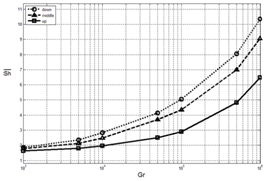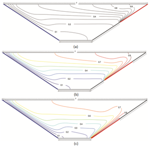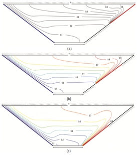 Figures 2-4 demonstrate the flow pattern, the temperature and concentration distributions for three different mentioned cases by plotting the contours of stream lines, isotherms and iso-concentrations for angle with following characteristics: Pr=0.71, Sc=0.63, GrT=106, N=0.2. Figure 2 shows the flow patterns inside the cavity for three different cases. In the first case, when the heating zone is placed on the top of the right sidewall of the cavity (Figure 2(a)) there exist two inner cells each at the top-right near the heating zone and in the middle near the cold wall and the remaining parts of the cavity are less activated. In Figure 2(b) where the heating section is in the middle, there is a principal cell occupied almost the whole cavity. In the last case, when the heating zone moves to the bottom of the right side wall, there are two inner cells grown in strength. In comparison with the other cases, velocity and circulation rate of this section is a maximum. Figure 3 illustrates the temperature distribution inside the cavity for these cases by plotting the contours of isotherms. Figure 3(a) displays isotherms for top active heated section and convection near the active section is converted to conduction. In contrast to the other cases, in this case the rate of heat transfer contributes to the least. When heating section moves to the bottom part of the side wall a thermal boundary layer forms near the active zone, and convection can be seen from isotherms, Figure 3(c). It is important to note that in this case heat transfer rate is a maximum. The distribution of concentration is shown in Figure 4(a-c). As it can be seen, the isopleths of concentration has similar behaviour as that of temperature and this is mainly because of the similarity of energy and mass transfer equations. It is also significant to mention that due to Prandtl number which is almost equal to Schmidt number (Le=1), the mass and the thermal diffusivity have similar effect on fluid.