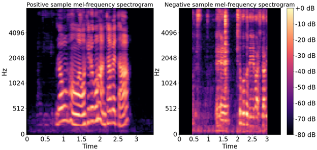 For classifying our data into the classes of human speech or TV sound, we chose to use an artificial neural network, more precisely, a convolutional neural network (CNN). CNNs are used for pattern recognition and are useful to get accurate results when processing images. To use audio data with CNNs, an image representation is needed. This is why we transformed the audio samples into spectrograms, and later into mel-spectrograms. This approach has been used before to classify emotional states from voice samples,17 achieving high accuracy. We processed our dataset using the Fast Fourier Transformation (FTT) to obtain information in the frequency domain in the form of spectrograms. We opted for a narrow-band spectrogram, which allows a fine, detailed resolution regarding frequencies.18 We then mapped the spectrograms into mel-spectrograms to obtain better information about the voices present in the samples. We used a length of 2048 for the FFT window, 512 as hop length, and 2084 as the size of the Hanning window. We then used a filter bank of 128 bins to obtain the mel-spectrogram representation of the samples. Figure 1 shows a sample of the mel-spectrograms obtained from TV sound and human speech from the same household. The figure shows that even though both images have clear frequency resolution, represented by the horizontal white lines, there are clear differences in their resolution and differences in power in the harmonics. There is more power in defined frequencies and their harmonics in human speech than in TV sound. In our process, we aim to detect these frequency differences in order to classify the audio as human or spoofed speech. The mel-spectrograms we used were reduced to one channel, creating a black-and-white image, to reduce the computational cost in terms of storage and future processing.