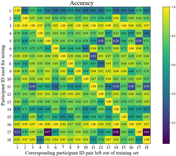 Using the accuracy metric, we built a matrix that shows the score of each trained model using one of the pairs for testing, which can be seen in figure 3. Each square in the matrix corresponds to the accuracy obtained when data from the ID indicated in the vertical axis was used for testing, while the corresponding ID in the horizontal axis is the pair left out from both training and testing. We trained 153 models, so each model is tested twice, one with each left out pair. Therefore, for example, the square with ID 1 in the horizontal axis and ID 2 in the vertical axis uses the same model as the square with ID 1 in the vertical axis and ID 2 in the horizontal axis, changing only which of the two was used for testing. In our case, the matrix is not symmetric, which suggests the left-out pairs does not have a symmetric influence with one another. The main diagonal has no value as it was added for keeping the matrix in a squared shape.