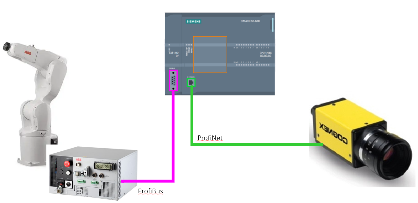 The architecture implemented in the ABB cell connects all components through automation networks. The camera is connected via ProfNet network and the robot via ProfiBus network. In the middle of the two is the PLC that bridges the two networks, as shown in Figure 11.