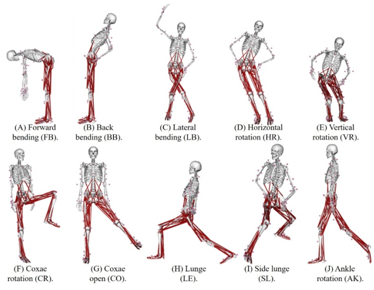 In addition, the use of CoP trajectories was helpful for recognizing whether there was a difference in MMH between skilled experts and unskilled novices during lifting or not.3 If such a difference existed, we could determine what MMH characteristics of experts helped them handle the burden more safely. Our findings showed that most of the skilled experts moved the CoP positions to the opposite side during left asymmetric lifting through modification of the hip position. We inferred that this characteristic of the experts may be involved in lightening the burden on the waist during asymmetric lifting. Recently, our authors have proposed a unique exercise for the logistic workplace which warms up the specific muscles that are activated during lifting by using a musculoskeletal simulation.4 Figure 3 shows the results of proposed static posture through all of the activated muscles. Based on the advice of physical therapists, it was possible to formulate these with exercises in which the workers who were the subjects could move without straining themselves. Our exercise enables logistic workers to improve the stretching potential of specific muscles, although the limitation of the exercise was not to improve the power potential of muscles. Through clinical tests, it was proven that the stretching ability of muscles might be helpful for improving the balancing ability during lifting. All achievement of research is applied to the actual logistic workplace in order to reduce the ratio of occupational MSD.
