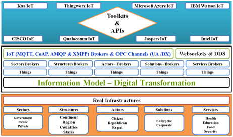 MQTT, CoAP, AMQP and XMPP multiple brokers for IoE and IoT, OPC UA for Industrial IoT(IIoT) and one block using DDS and Web sockets is our contribution to ensure QoS and interoperability at the same time. Our contribution facilitates all the cases for M2M, D2D, M2C, M2D, C2C, D2S, M2S, S2C, S2S (M: machine, D: device, S: Server and C: cloud). Information model for hard coded primitive infrastructures is the first step of infrastructure-centered model (ICM). Brokers for these four protocols are given in Figure 1 with the naming convention we used in our code. Many IoT infrastructures are available in the market by top vendors ARM, Intel (IntelIoT), CISCO (Cisco-IoE), Telit (Telit-IoT), Jasper (Jasper-IoT), Cumulocity (IoT), Davra Networks, Samsung, Qualo command HP with various features. The proposed model is shown in Figure 2. In order to utilize any infrastructure, first the information model of real infrastructures (e.g. Smart Energy, Smart Industry, Smart Government, Smart Academia, Smart Health) has to be designed using database engines. Secondly, a generic application-programming interface (API) for a given IoT architecture is available by top IoT vendors to communicate with a particular database management system. The application-programming interface API customizes the entire IoT infrastructure with respect to real infrastructures. In this paper, we have used the datasheets approach to populate our database using the datasets of a given infrastructure. The hardware architecture is static as per things in a particular infrastructure. The sensor cards are mentioned in Table 1 and parameters will remain static or fixed as defined in the datasheet of a particular object of class in the infrastructure, e.g., an object truck's datasheet will define which variables have to be measured by which sensors. The datasheets have to be provided by the regulatory authority for a given infrastructure sector, structure, actors, solution and service. In this model, analytics is centralized where the API and information model are key parameters. In this work, we have used a top-down design with Water-Fall Software Development Life Cycle (SDLC) approach.16 To ease adaptation and implementation of the system along with enhanced scalability the documentation is integrated. This model scales the best capabilities of original equipment manufacturer (OEM) IoTs,6 OEM architectures and interoperability of IoT platforms.7 The first challenge is integration of interoperable hardware architectures and platforms. At a time, we will be dealing with one architecture using different platforms. Every proprietary IoT framework has its own definitions to classify sensors nodes, cables, drivers, network switches, IoT gateways, computers, servers and all the architecture specific software and hardware of a single vendor.8 Specifically Programmable Logic Controller(PLC), Process Automation Controller(PAC) and Distributed Control System (DCS) based nodes OPC (Object Linking and Embedding (OLE) for Process Control) is used for scalability and flexibility of merging IIoT and IoT as we have an infrastructure of Industry 4.0 (Smart Industry) also. At gateway or in parallel to broker layer we have used OPC DX (Data Exchange) and as whole middleware we have used OPC UA (Unified Architecture).