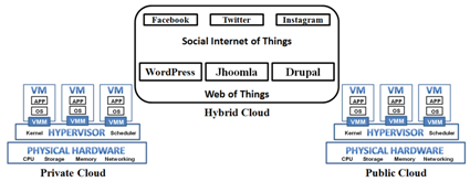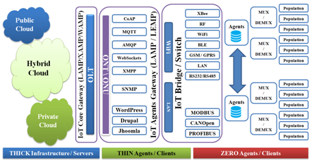 The approach is based using the features of three giants of IoE i.e. Web of Things (WoT), Cloud Virtualization (for Virtual Desktop Interface (VDI)) and Social Web of Things (Facebook, twitter and Instagrametc.). Cloud virtualization is one of the techniques to ensure scalability of hardware resources virtualization has to be utilized for VDIs. A normal person in this 21st century world has only three personal sources of information i.e. SMS, email and social media. Excellent sources of population attention and involvement are social media and websites. Our system publishes on Facebook, twitter and Instagram. A conceptual and implemented model of our IoE is given in Figure 3. Cloud is used as infrastructure as a service (IaaS) to achieve scalability of workflow and management. Thick, thin and zero clients are the most powerful tools for utilizing scalability of hardware at lowest costs. A brief understating of thick, thin and zero clients is given in Figure 4. First of all the sensors or data acquisition points or variables will have impact factors or roles for a particular applied agent or object (e.g. Smart Grid and Smart Academia). Then, every infrastructure set or class of agents will have its specific protocols depending on the data nature and bandwidth requirement (e.g. MODBUS, CANBUS, SNMP, PROFINET, and BACnet). In this context, every network address will be enough to identify the infrastructure being addressed. This serves two-fold purpose:
