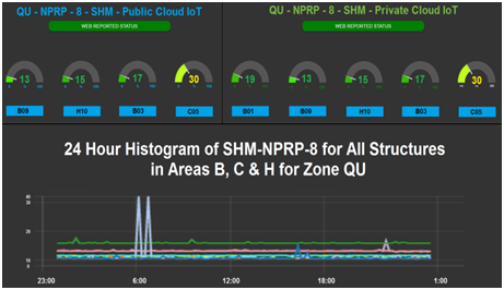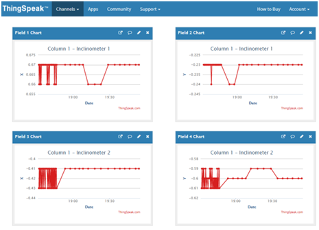 Package 3: Structural health monitoring has been used as a benchmark for testing ICM and ACM. Tests have produced very phenomenal results in and are shown in Figure 8 for ThingSpeak IoT platform. Sensors values from inclinometers using CAN-Open nodes have been shown as an operating example of ICM that is proprietary platform on public cloud. The system was at remote location in form of CAN-Open based tilt meters nodes connected to Raspberry Pi 3 and accessed through Wifi. The physical site chosen for this system was Qatar University Bridge as shown in Figure 9.The Wifi was linked to optical network terminal (ONT) and all nodes through ONTs forming an optical network. Optical network of ONTs was sending data to optical line terminals (OLTs). The WoT implementation can be seen in private cloud zero client screen in Figure 10. Multiple graphs, trend durations and dual cloud as shown in Figure 11, make it easier for implementation and customization for organizations and any client specific requirements (Figure 12).