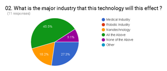 There was survey taken on Nanobot technology. Author expected ten members and actual members were eleven. Below are the graphs that can be interpreted. Based on the interpretation of above graphs and its response it is noted that most of the members would think this technology would be benefit for human mankind. Form for this data can be viewed on the google form (https://goo.gl/forms/aiyjCuiScZzQBfeq1) Figure 8–12.