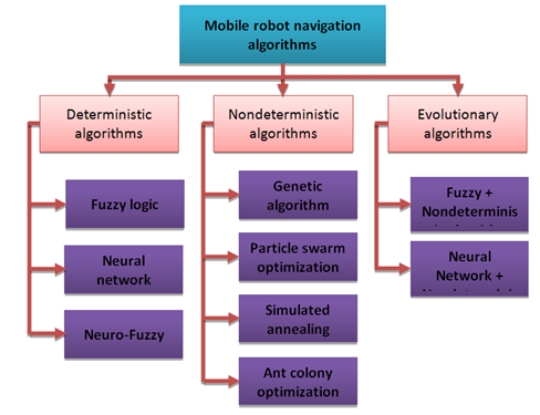 Figure 1 General classification of the Deterministic algorithm, Nondeterministic (Stochastic) algorithm, and Evolutionary algorithm used for mobile robot navigation.