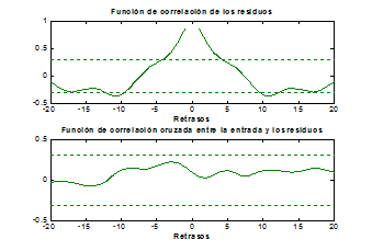 Figure 2 shows the residuals, where it can be seen that both the correlation function and the cross correlation function are within the confidence levels For the validation of the model in H4, the comparison of the output of the model with the real output was made, which is shown in Figure 3, where it is observed that the output of the model is quite close to the real one.