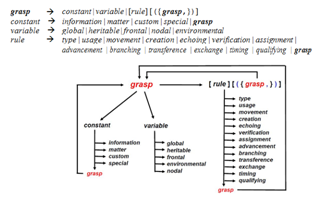 The created infrastructures, which may be left active, can effectively support or express distributed databases, command and control, situation awareness, autonomous and collective decisions, as well as any other existing or hypothetical computational and/or control models (like, say, neural networks or Petri nets). They can also be the result of spatial matching of arbitrary graph–based patterns in SGL with already existing knowledge networks previously organized by SGT or any other models and technologies.SGL has a deep recursive structure with its top level shown below, also in Figure 6, which reflects the space–covering–grasping–creation–matching–echoing nature of SGL scenarios (where words in italics represent syntactic categories, square brackets show optional constructs, braces indicate repetitive parts, and parentheses and comma being the language symbols).