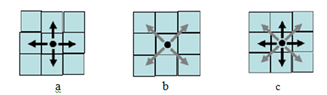 The tiles–nodes may have different links with surrounding nodes. We are assuming here that each node has links with four direct neighbors, if all exist, having common edges with them, as in Figure 8a (on its up, down, left, and right). It may also have additional links with the four corner neighbors (if all exist too) as in Figure 8b, thus generally having eight all neighbors in total, as in Figure 8c, if all such neighbors are present in the mosaic picture.