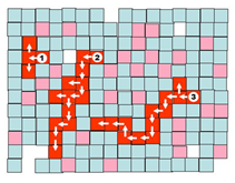 repeat(COLOR != pink; hopfirst(direct_neighbors); decrement(Depth, 1); if(Depth == 0, abort));
