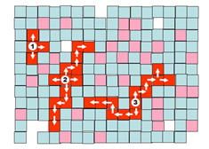 The following scenario is supposed to be applied from some mission Headquarters, which may be inside or outside the considered networked model. Starting from the black tile with known Danger_coordinates, it spreads in parallel throughout the tiled space via non–pink tiles as direct_neighbors, and as far as possible, with blocking cycling to the already visited tiles. This is being done unless meets the first pink tiles, where it stops, as shown in Figure 12 (these finally reached pink tiles are highlighted now in red too).