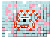 Let us make this scenario a bit more advanced. In the current solution, if no full chain of pink tiles exists around the Danger element, the spreading parallel spanning tree algorithm may not stop at all, or can just reach the tiled space boundaries if they are limited in distance. We may introduce certain allowed max_distance using variable Depth to forcefully stop this tree–spreading process if it exceeds the allowed depth, with indication and warning that the closed fence solution around the danger cannot be found. Also, in case of existence of the closed fence, we may involve in the tracing–destroying operation not only each finally reached pink (now red) tile separately, but also with their direct all_neighbors also belonging to the fence, say, by asking simultaneously the latter to assist in this operation. This setting cooperation between all perimeter neighbors, like of integral system, as shown in Figure 13 and by the extended SGL scenario that follows.