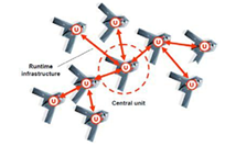 The obtained resultant scenario combines loose and randomly semi–oriented swarm movement in a distributed space with periodic updating of topologically central unit (as units are changing distances and relative positions in space), and regularly forming updated hierarchical infrastructure between them starting from the new central units. This infrastructure controls observation of distributed territory with collection of potential targets at the current central units, distributing them back to the vehicles for local assessment, selection and impact of most available or suitable targets.