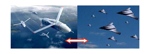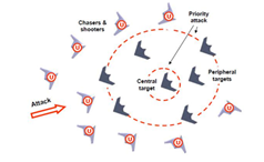 Basic ideas of a possible swarm against swarm fight scenario may be as follows, some also shown in Figure 19.