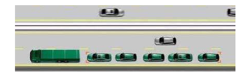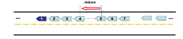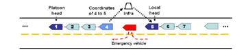 Due to dynamic road conditions, traffic signals, road speed limits, and other factors like, for example, providing highest priority to emergency or police vehicles, a car platoon may suffer fragmentation. Such a situation is depicted in Figure 22, where between platoon vehicles 4 and 5 an emergency vehicle happened to appear on the same lane, which divided the platoon in two parts.