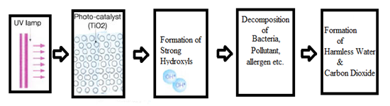 Hence, there is a need to purify air by using advanced process called Photo Catalytic Oxidation (PCO). In PCO Titanium dioxide is used as a catalyst which cleans the air.1-3 As air falls on this catalyst, electron will get energy and released at its surface. Then it will interact with water molecules in the air, as we know that electron having energy which breaks the water molecules into hydroxy1 radicals, hydroxide and hydrogen peroxide.4 These hydroxy1 radicals are more reactive so they attack organic pollutant molecules, breaking them into carbon dioxide and water which are harmless substance. The methods used for photo catalytic oxidation applications includes massive set ups and require ample time for computation and complex calculations. The complete photo catalytic oxidation process is shown in Figure 1.5,6 This process is responsible for purify air up to significant level, to measure that level there is a serious need of sensor which tell the percentage purification of air. Novel CMOS Integrated Pseudo PMOS UVPCO (PP-UVPCO) model having zero static power dissipation is presented in this research studies which gives an air and surface sanitization readings.7-9