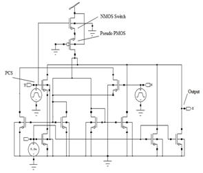 For the integrated sensor, the measurement circuit tracks the threshold voltage of the PCS which is varied as the concentration of O2 is varied. One of the solution to resolve the high power consumption problem by add-on sensor network is to integrate the sensor with electronics as a circuit component in an integrated circuit rather than as an add-on sensor whose output signals is further processed. In this research studies, the PCS is used as one of the input transistors in the differential stage of the current conveyor as shown in Figure 4. The function of the circuit is described as follows: In this circuit the PCS-Current Conveyor is configured as a voltage follower. In the voltage follower circuit the output voltage (Vo) is equal to the input voltage (Vin). This circuit is so sensitive that any difference in threshold voltages and bias currents between the two input transistors at the differential input stage will also appear at the output.