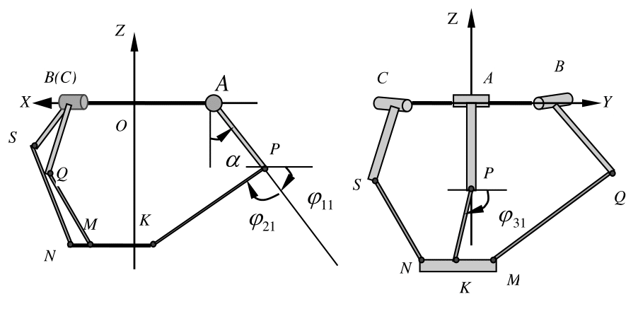 , which we consider to be homogeneous inextensible rods; M - masses of drives and J the inertia moments of motor rotors, as well as measuring sensors and reductor. We neglect the masses of the levers PK, QM, SN. This approach is quite justified from a practical point of view, since usually in most manipulators such moving parts are made as lightweight as possible and made of lightweight composite materials. Taking these masses into account does not complicate the model,35 using (4), it is possible to implement the transition21,24−35 to equations in redundant coordinates, by excluding dependent velocities from the Lagrange function (5).