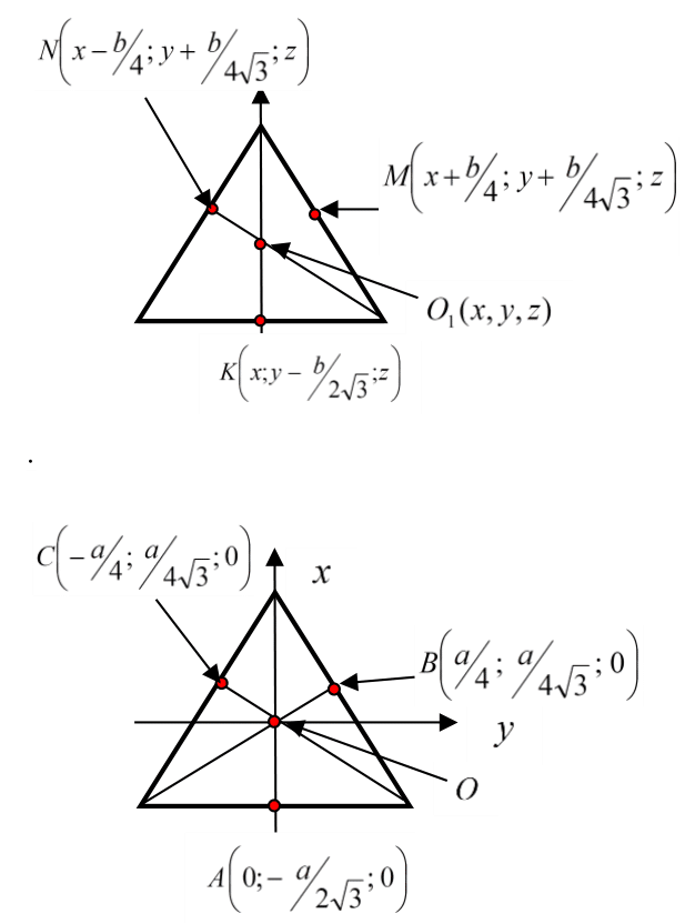 Since during translational motion the trajectories of all points of the moving platform are identical, the coordinates of the nodes K, M, N fixed on it are determined through the coordinates of its center