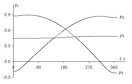 , equal to G=685 s. Figure 2 shows the changes in the components of quaternion Λ(t) that defines current attitude of a spacecraft in process of rotation maneuver: λ0(t), λ1(t), λ2(t), λ3(t). Finally, Figure 3 shows the dynamics of the components p1(t), p2(t), p3(t) of the unit vector p during optimal maneuver. The variables λj and pi are dimensionless quantities. It is characteristic that the change in the projection p1 is very small in comparison with changes in the projections p2 and p3 (the angular velocity component ω1 also changes a lot less on the interval of free rotation than angular velocity components ω2 and ω3). This confirms the fact that the OX axis is longitudinal axis. Unlike variables ωi, variables pi and λj are smooth functions of time.