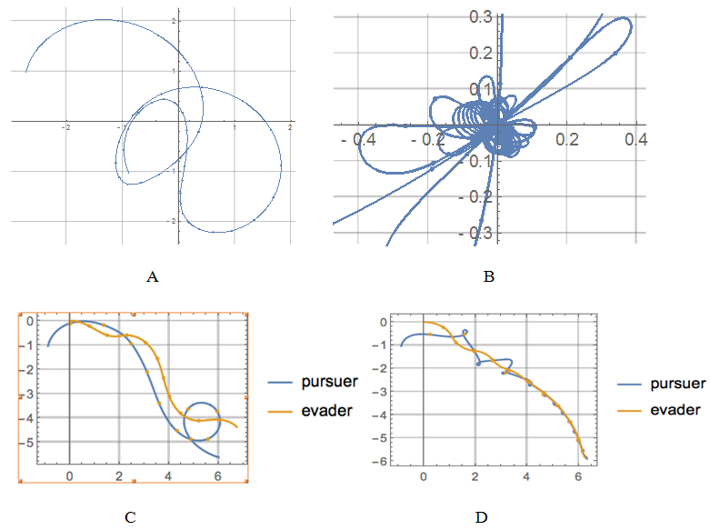 Figure 1 shows the effect of applying motion camouflage to a two particle system representing pursuer and evader in a two dimensional plane. Figure 1A shows the baseline between the pursuer and the evader (the line joining the pursuer and the evader at any given time) as the game proceeds with the camouflage feedback (proportional-P) law alone. Figure 1B shows the baseline variation corresponding to the case when integral (I) and derivative (D) feedback laws are applied in addition to the proportional (P) law based on camouflage strategy. Figure 1C, Figure 1D show the individual pursuer and evadertrajectoriesfor the cases P control alone and PID control respectively using camouflage strategy. Clearly the performance (in terms of shorter time for the pursuer to capture evader) is obtained with the PID control combined with the motion camouflage strategy compared to P-alone with the camouflage strategy.