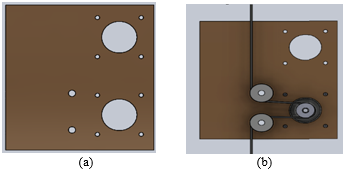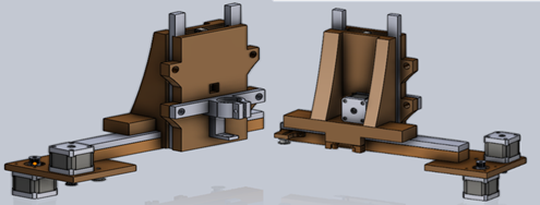 We designed the shape “Plate” in Figure 6a, the plate is designed to moves the electric drill in (x, y axis) by hold two stepper motors (x and y axis), two (Pulleys toothless), and wood part. For x - axis motor we installed two of “Pulleys toothless” to providing grip for the x-axis GT2 belt and the toothed pulley which goes on the stepper motor as shown in Figure 6b.