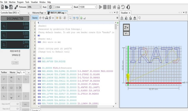 Printing a word using a CNC machine involves using a computer-aided design (CAD) software to create a digital model of the word (IRATJ) “international Robotics & Automation Journal” and then using a Gcodetool software to generate the toolpaths required to cut or engrave the word on a material using the CNC machine. Here are the basic steps to print a word using CNC8,9: