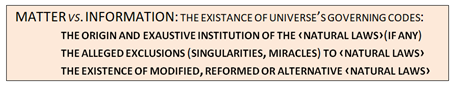 The dualism is alternative to monism. It assumes autonomy of matter and information, as if a self-reliant abstraction applies, to preside over intangibles. Transcendence opposes to immanence; the godlike sphere includes a ‹designer›, out of the material one. The divinity is inspired absolute representation of detached truths, not changeable, since coming out from God directories. The resort to an upper world, out of men’s universe, requires the ‹faith› in the existence of the heavenly reality, since, being out of material views, we cannot experiment on it. The guesses of the God-driven dualism are echoed by the men’s religions, which developed on earth, to assign the categorical imperatives to the invented socio-political ‹collective orders›.