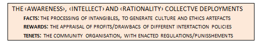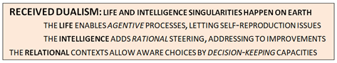 At the moment, ‹biology› and ‹cognition› do not merge; the ‹spirit›, at the received duality range, deals with intangible supplements, basically, conditional build-ups and personal identifications, to extract actors with awareness, intellect and rationality. The meaning of the incorporeal supplements is left to a posteriori assessments; yet, the ‹spirit› deeply modifies the earth’s scenarios, by the cognition aid (Figure 11), because:
