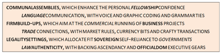 The cosmos’ order has apparent trustfulness, when described by ‹natural laws› with absolute worth. The received dualism establishes on ‹relational modes›, i.e., on the sets of culture/ethics artefacts accredited to characterise the given civilised community (Figure 3). Only men, among the animals, can be: coached to possess idioms, prepared to profit by bargains and businesses and advised to conceive governance authenticity. The setups, thereafter, are stated as a posteriori ‹rational› choice, not possessing a priori worth.19-24