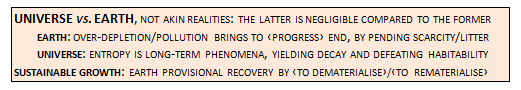 The contingent (in lieu of absolute) trust in the ‹progress›, ineludibly, links with our limited access to the ‹cosmic truths›, ‹matter› and ‹information› and allied ‹natural laws›, if any. It connects, moreover, with the ambiguities of the scale effects between our hangouts and the entire universe (Figure 4). The absolute readings entail entropy trends; our retreats’ ecology is further damaged by depletion and pollution queries.25-29